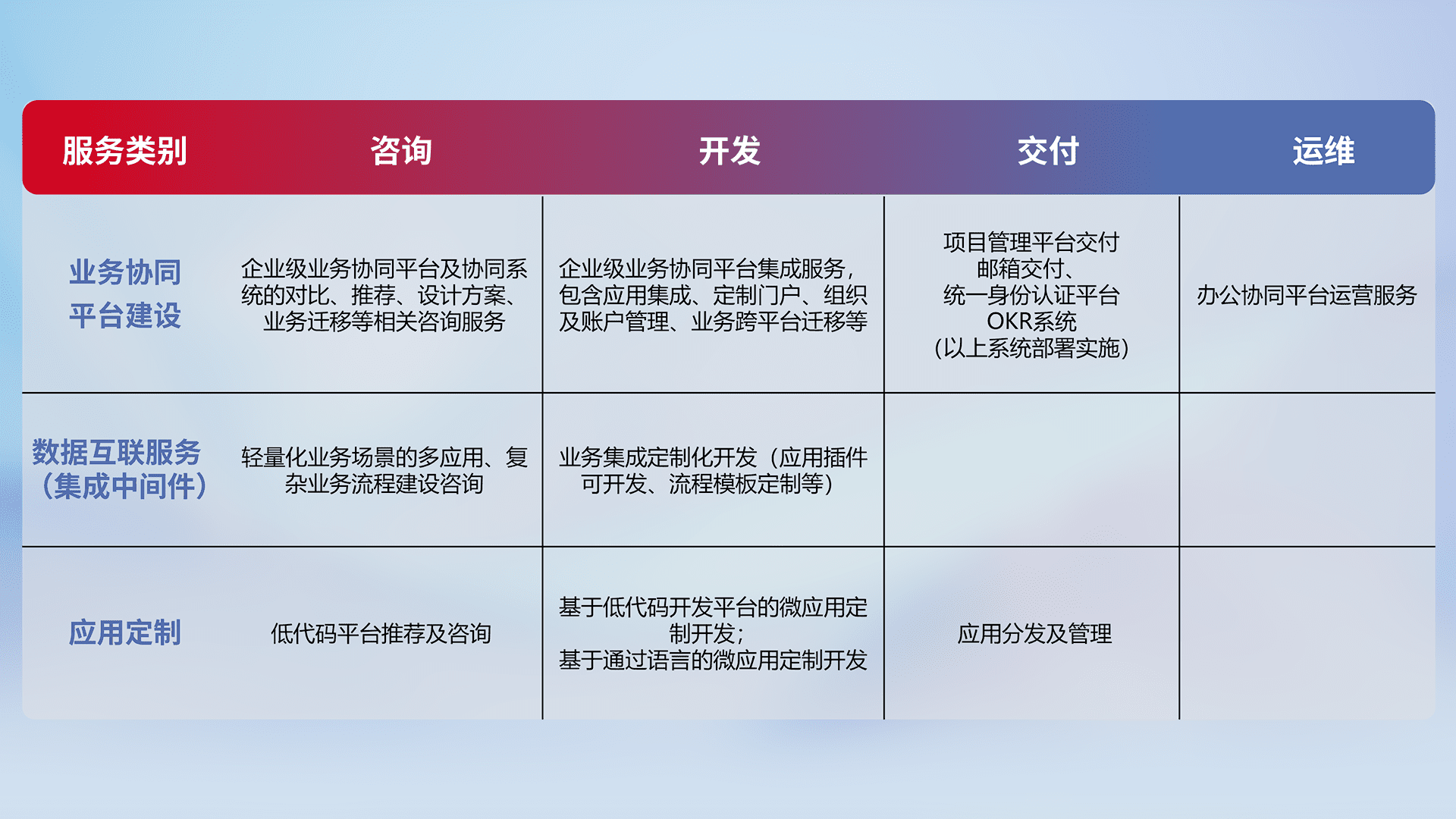 针对钉钉、、、、企微、、IDaas等平台级产品提供产品的规划、、、方案、、交付、、定制化开发等服务,,,实现如统一协同办公、、智能客户服务、、混合会议管理、、、、智能数据查询、、、等业务场景,,,,实现数字化转型。。。